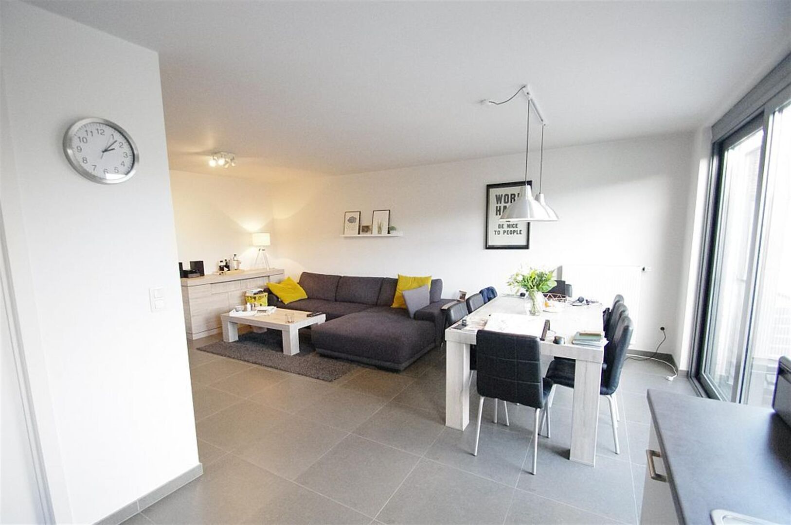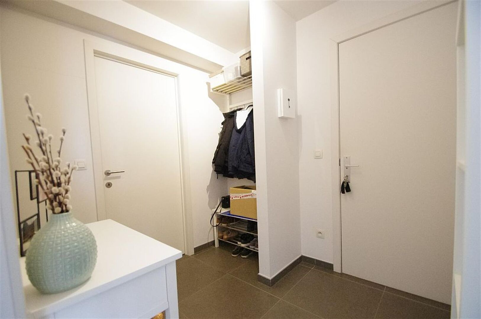 Via de inkomhal kom je in de ruime, lichtrijke woonkamer met open, volledig uitgeruste keuken (vaatwasser, frigo met vriesvak, vitrokeramisch fornuis en combi-oven). Aansluitend bevindt zich een praktische berging met aansluiting voor wasmachine en droogkast. De badkamer is uitgerust met een lavabomeubel, douche en toilet. Het appartement beschikt over twee volwaardige slaapkamers.