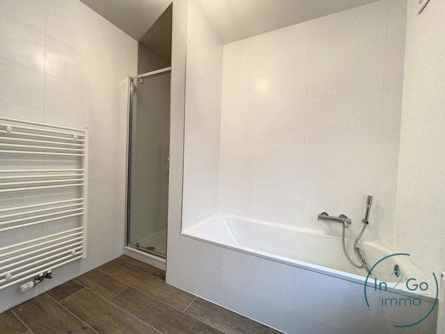 De badkamer is uitgerust met een douche, bad en een modern lavabomeubel.