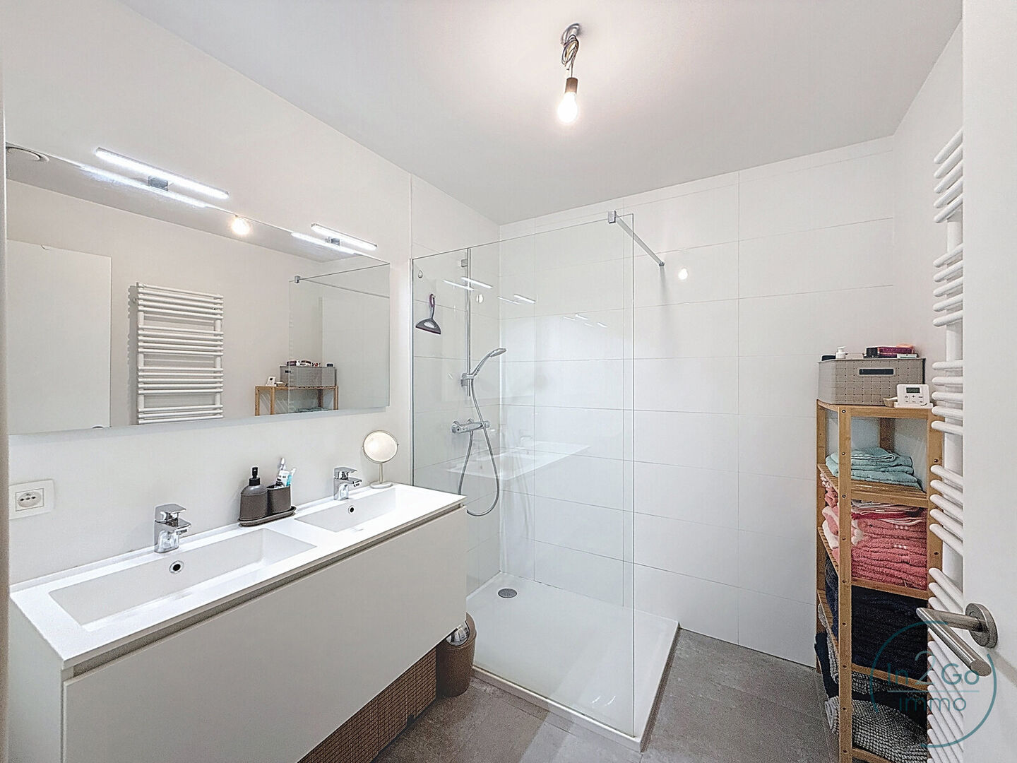 Het appartement beschikt over twee volwaardige slaapkamers (van 12 m² en 11 m²). De moderne badkamer is uitgerust met een inloopdouche en een dubbel lavabomeubel.