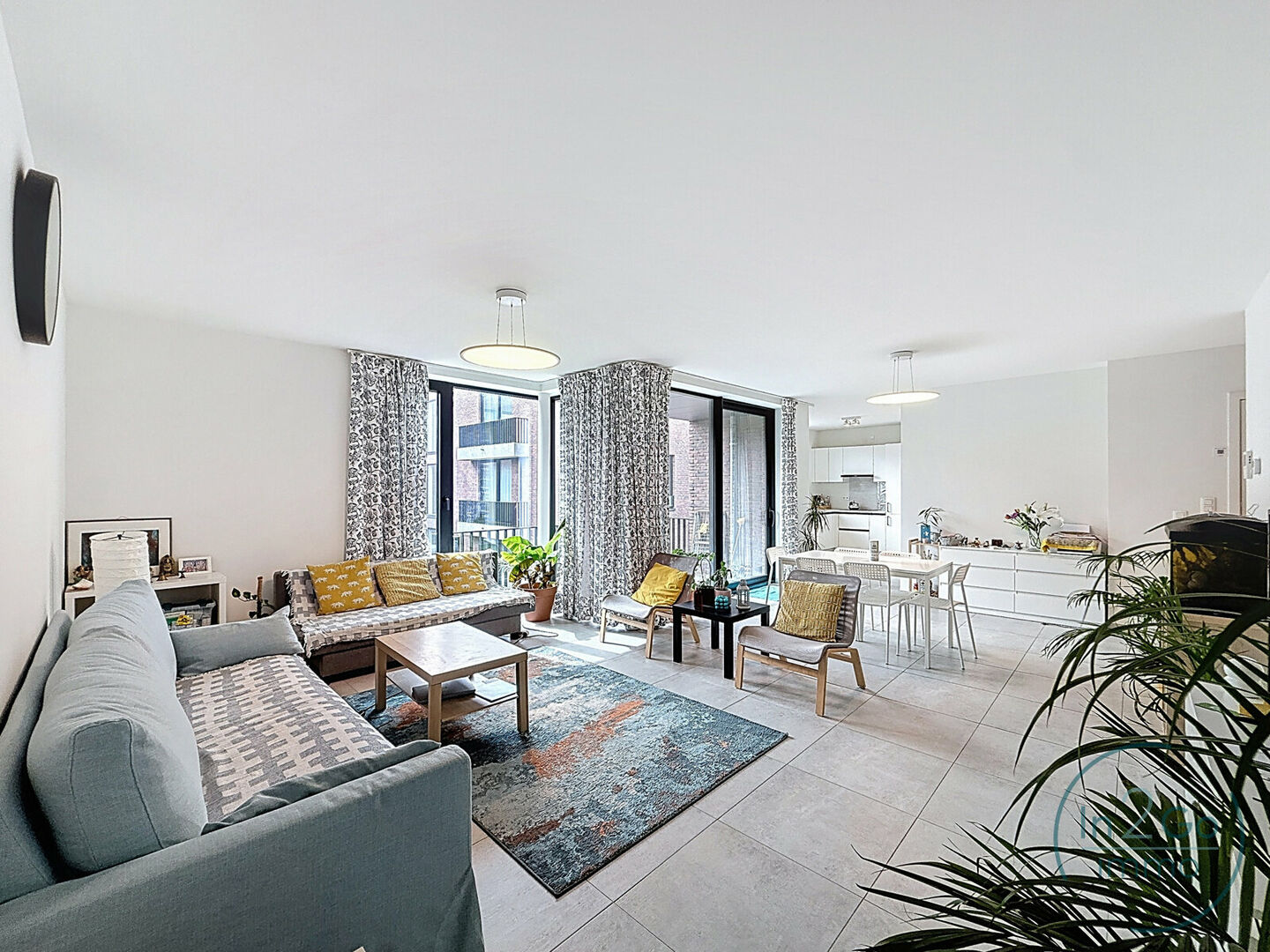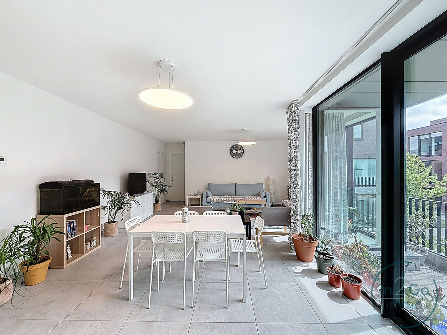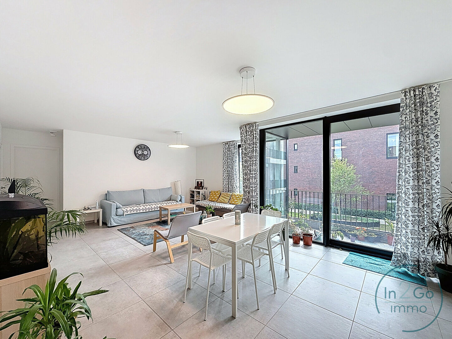 Het appartement bevindt zich op de eerste verdieping en verwelkomt je via een inkomhal met een apart gastentoilet en een berging. De lichtrijke leefruimte sluit naadloos aan op het terras. De open keuken is volledig ingericht en uitgerust met moderne toestellen zoals vitrokeramische kookplaten, een ingebouwde koelkast met vriesvak, een combi-oven en een vaatwasser. Aansluitend is er een praktische berging (aansluiting wasmachine/droogkast).