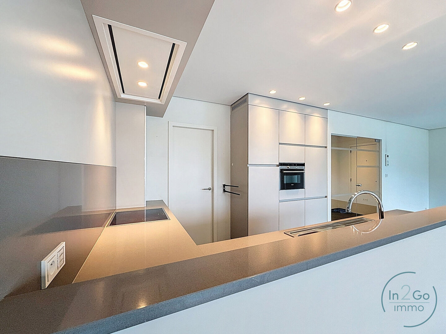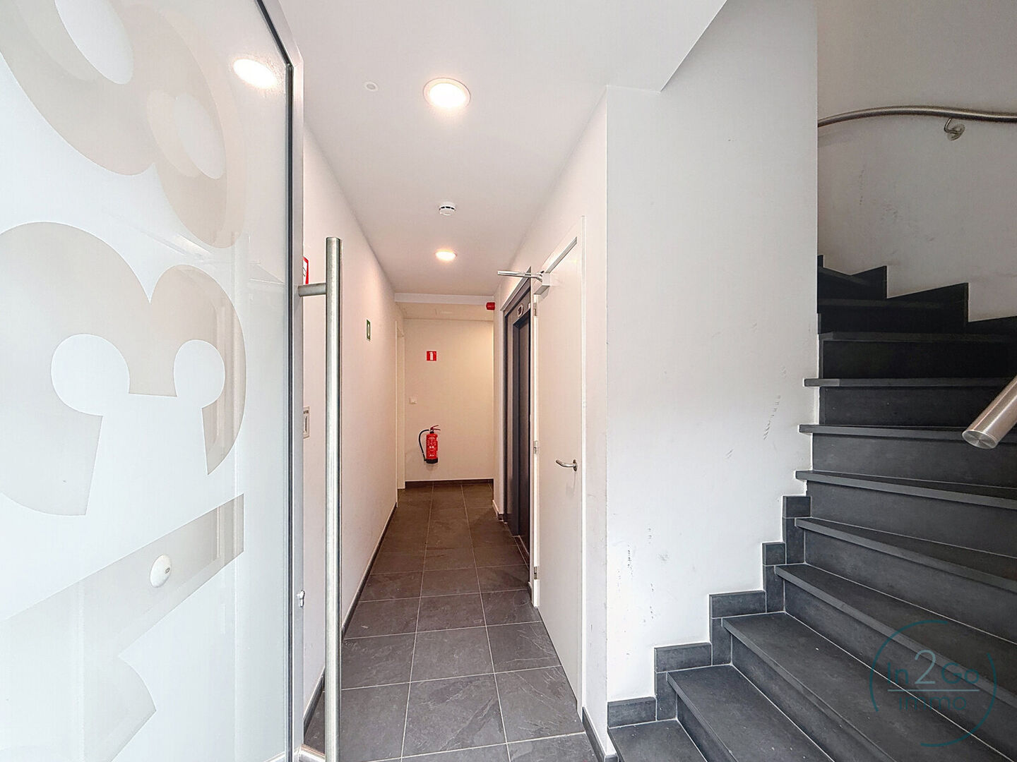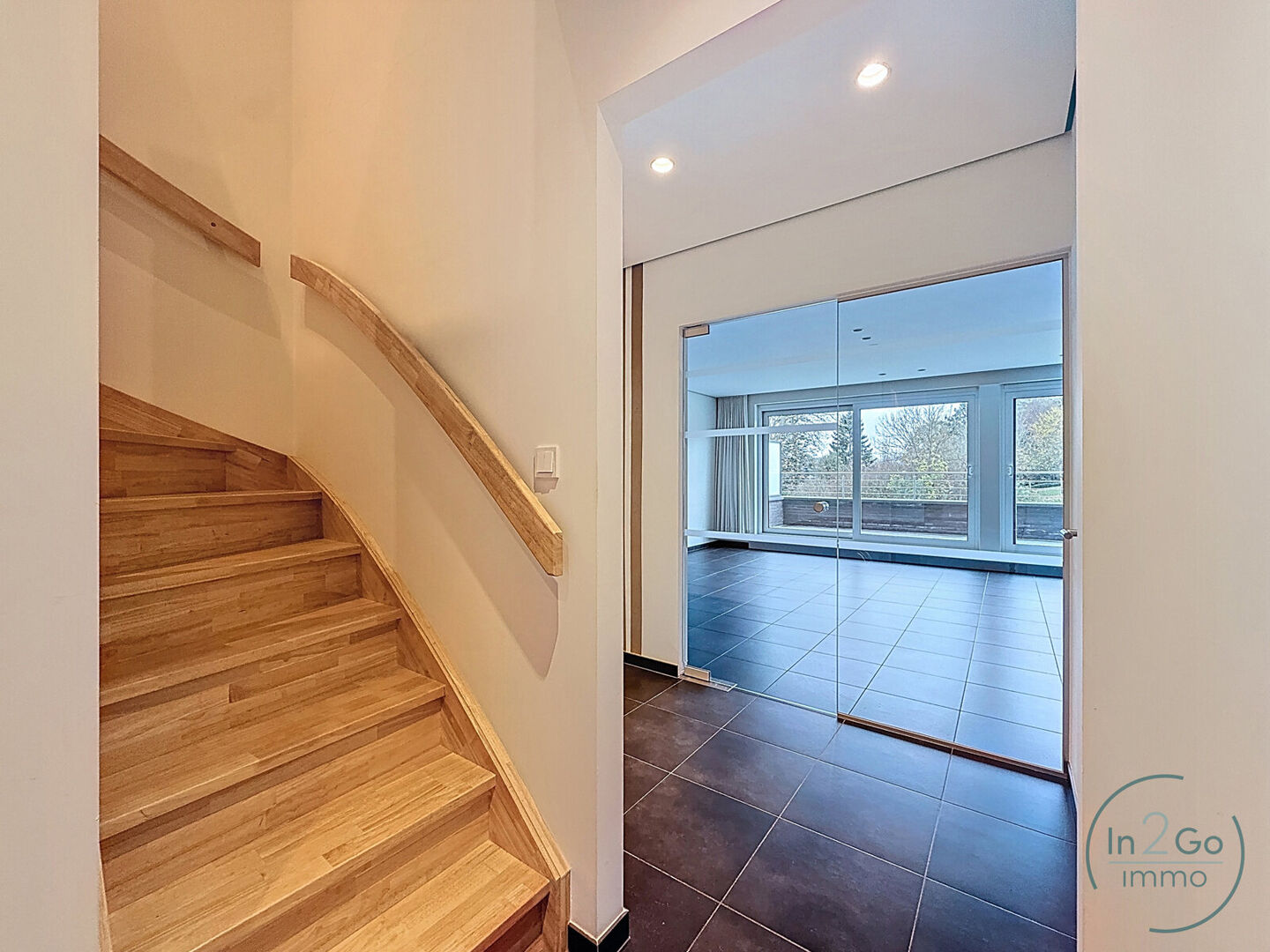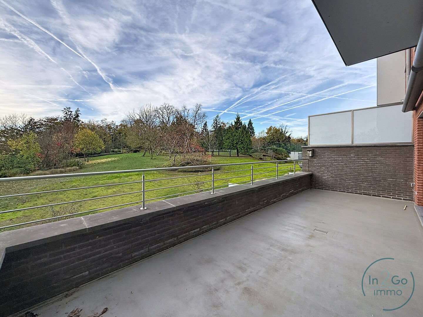 Dit ruime, energiezuinig duplex-appartement bevindt zich in een recent en uitstekend onderhouden gebouw met lift. Op de eerste verdieping verwelkomt de inkomhal met vestiairehoek en apart toilet u in een lichtrijke leefruimte, opgedeeld in een zithoek en eethoek, met grote raampartijen over de volledige breedte. Twee schuiframen geven toegang tot het grote terras waar u kunt genieten van een prachtig open zicht op de weidse gemeenschappelijke parktuin. De moderne, volledig geïnstalleerde open keuken, met aansluitende de praktische ruime berging, sluit naadloos aan op de leefruimte. Verder is er op dit niveau een ingerichte badkamer met toilet, lavabomeubel en ruime inloopdouche, en één slaapkamer.
