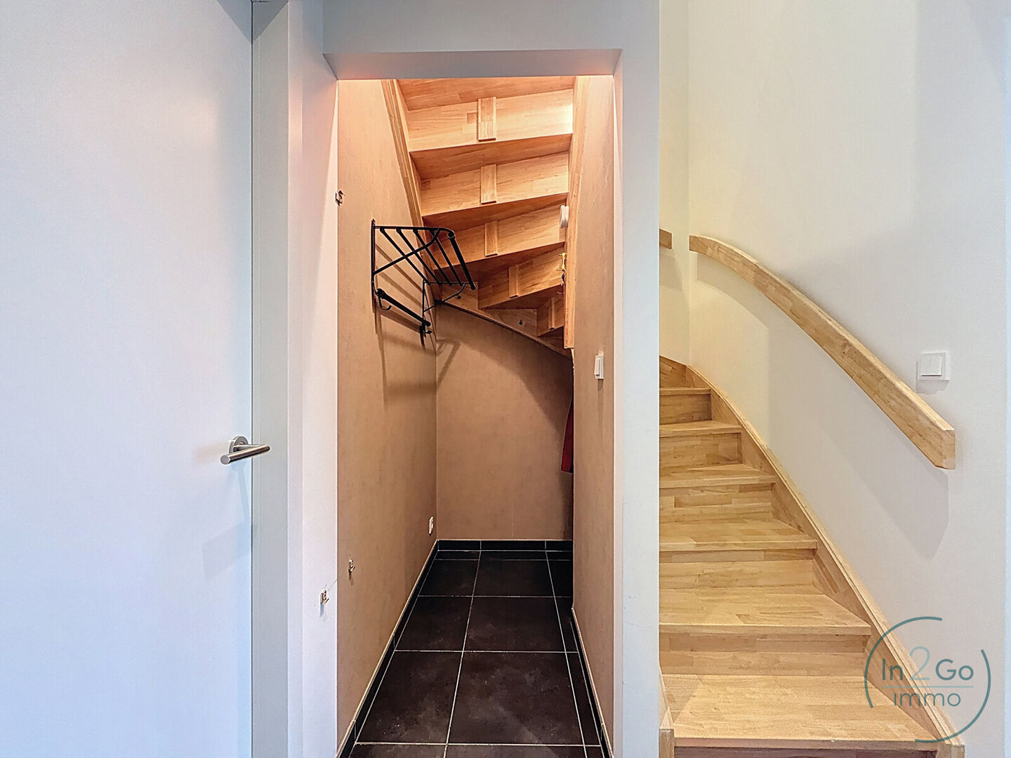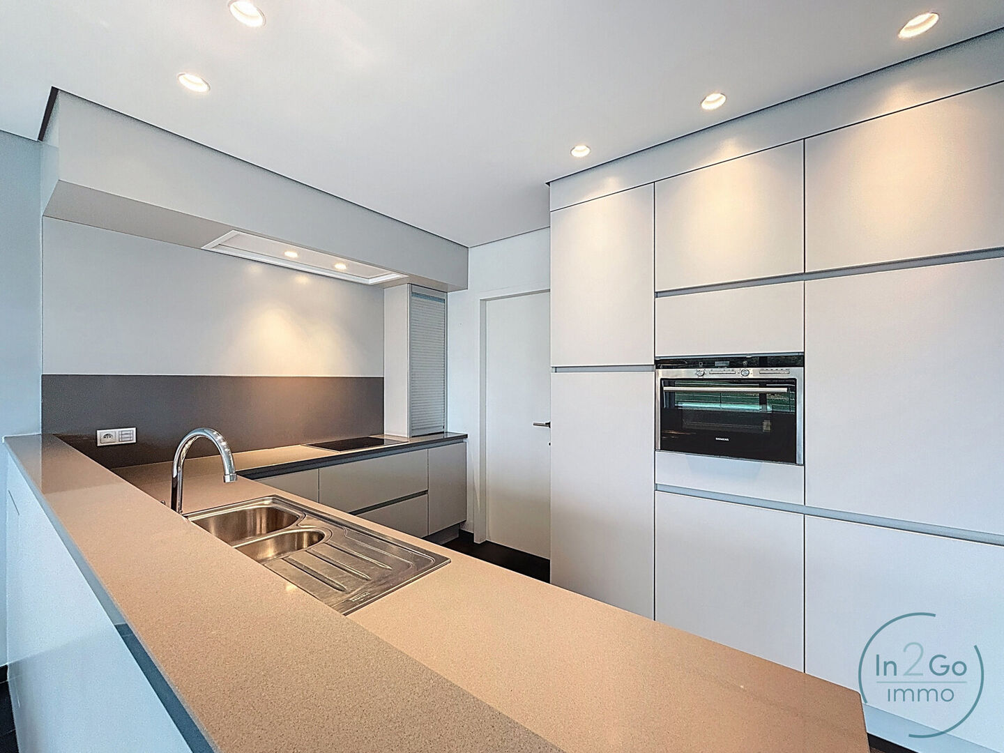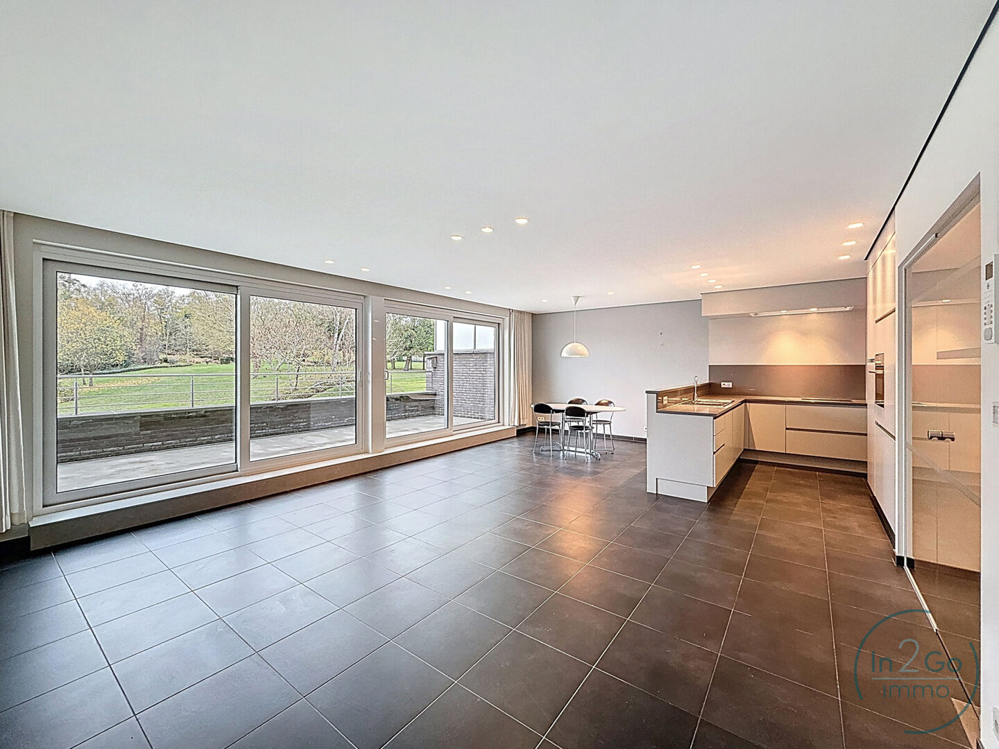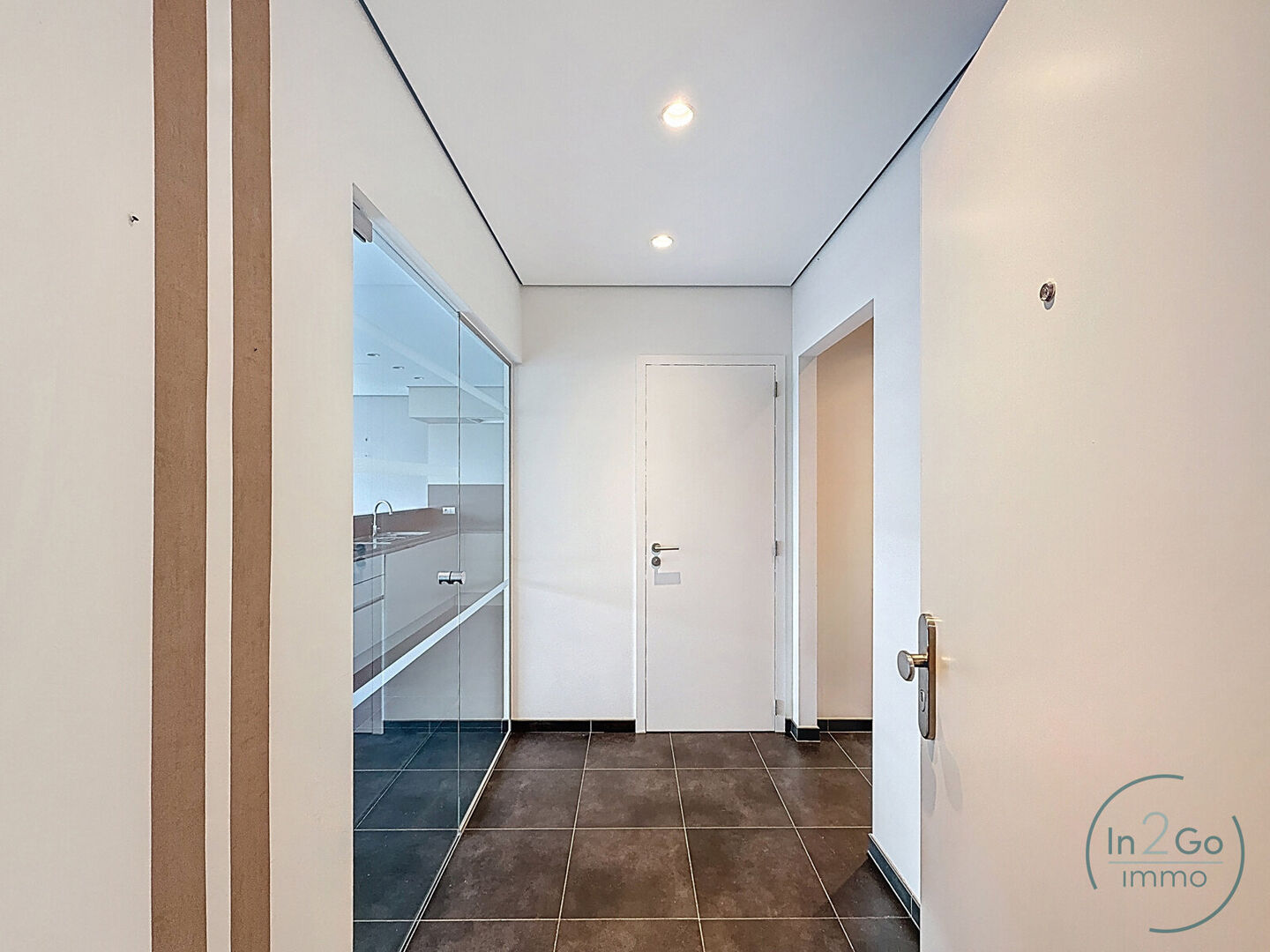 Dit ruime, energiezuinig duplex-appartement bevindt zich in een recent en uitstekend onderhouden gebouw met lift. Op de eerste verdieping verwelkomt de inkomhal met vestiairehoek en apart toilet u in een lichtrijke leefruimte, opgedeeld in een zithoek en eethoek, met grote raampartijen over de volledige breedte. Twee schuiframen geven toegang tot het grote terras waar u kunt genieten van een prachtig open zicht op de weidse gemeenschappelijke parktuin. De moderne, volledig geïnstalleerde open keuken, met aansluitende de praktische ruime berging, sluit naadloos aan op de leefruimte. Verder is er op dit niveau een ingerichte badkamer met toilet, lavabomeubel en ruime inloopdouche, en één slaapkamer.