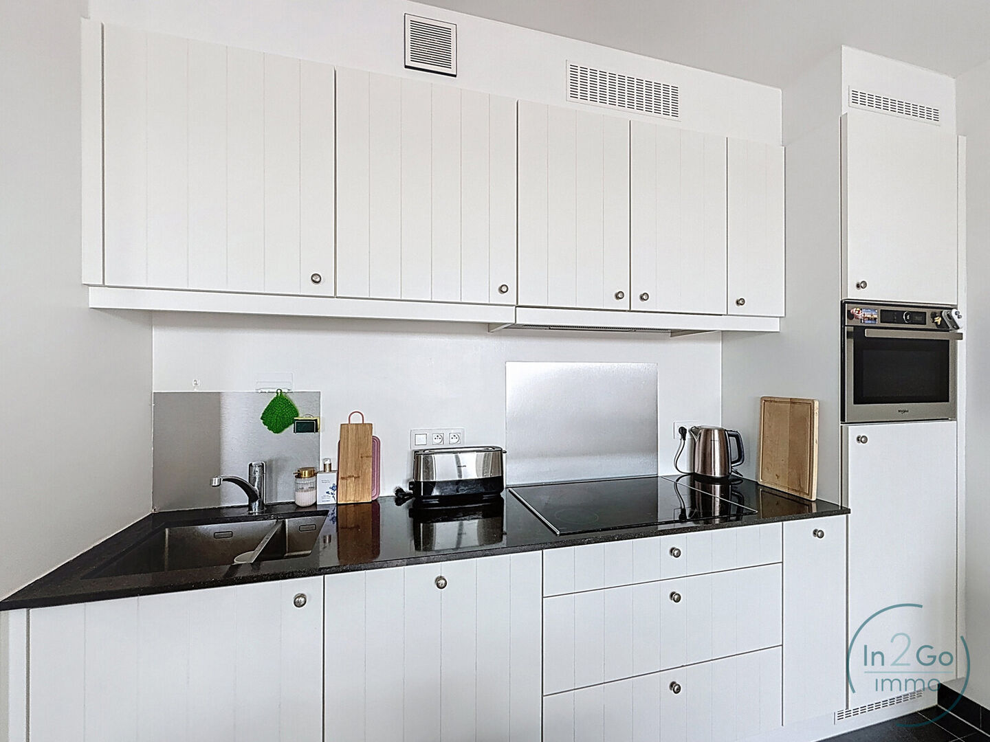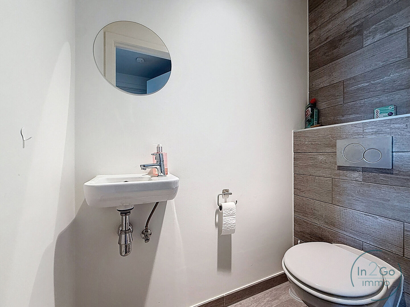 Via de inkomhal met praktische vestiairehoek en apart gastentoilet kom je in de open leefruimte, waar de grote raampartijen zorgen voor een overvloed aan natuurlijk licht. De volledig ingerichte keuken is uitgerust met kwalitatieve toestellen zoals een combi-oven, inbouwkoelkast met diepvriesvak, vitrokeramische kookplaat, dampkap, spoelbak en vaatwasmachine – ideaal voor wie houdt van koken met zicht op het groen.
