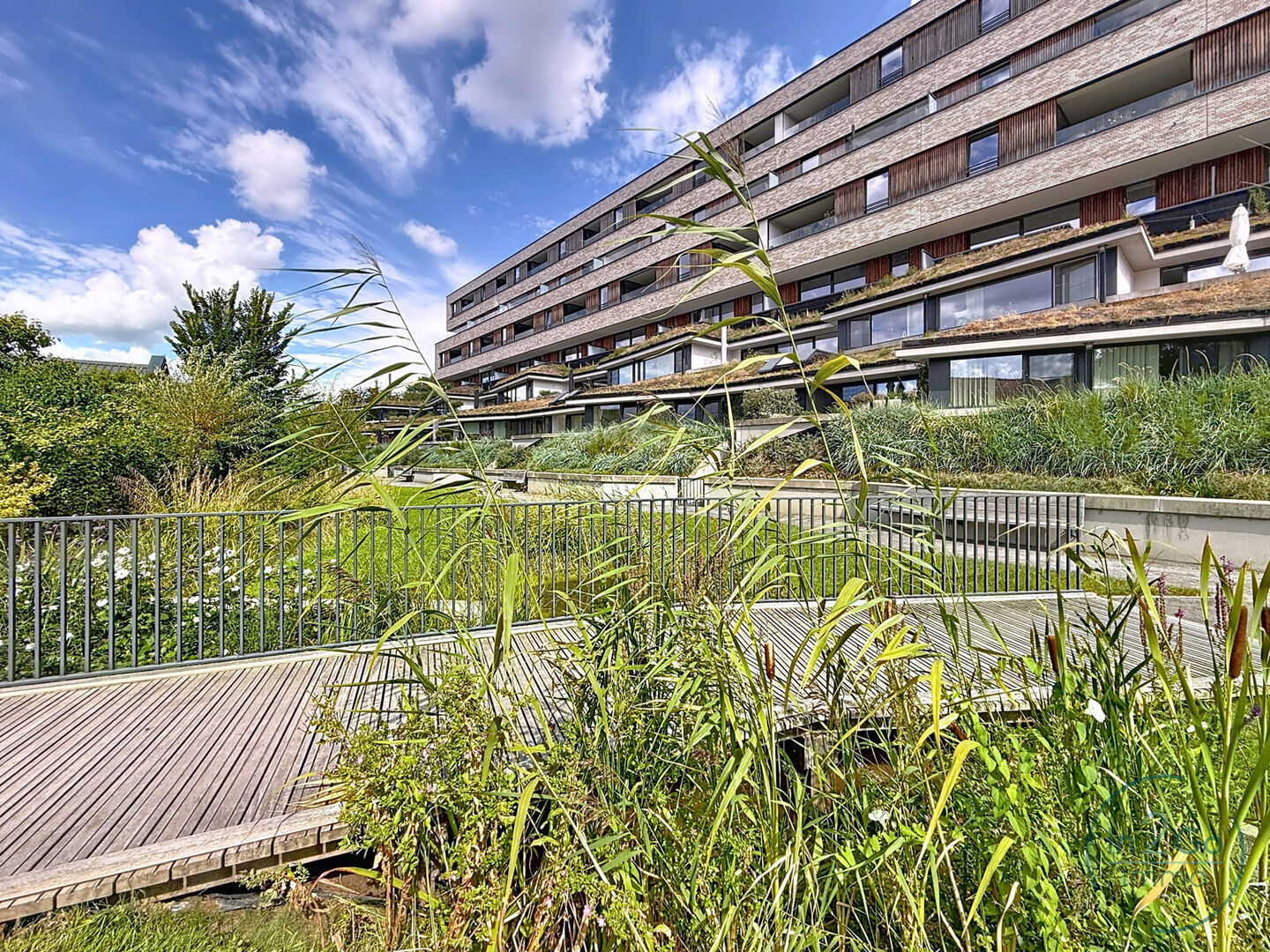 De leefruimte geeft uit op een aangenaam, zuidwestgericht terras met een rustgevend uitzicht op het omliggende groen en het mooi aangelegde park. Verder beschikt het appartement over twee volwaardige slaapkamers, een moderne badkamer met inloopdouche en dubbel lavabomeubel, en een ruime berging met aansluiting voor wasmachine en droogkast.