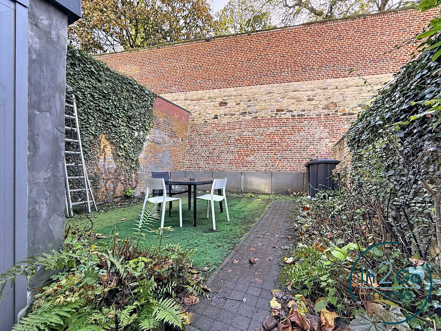 Achteraan geniet u van een charmante stadstuin, uniek gelegen tegen de historische stadsmuren van Leuven—een bijzondere troef die studenten extra woonkwaliteit biedt midden in de stad.