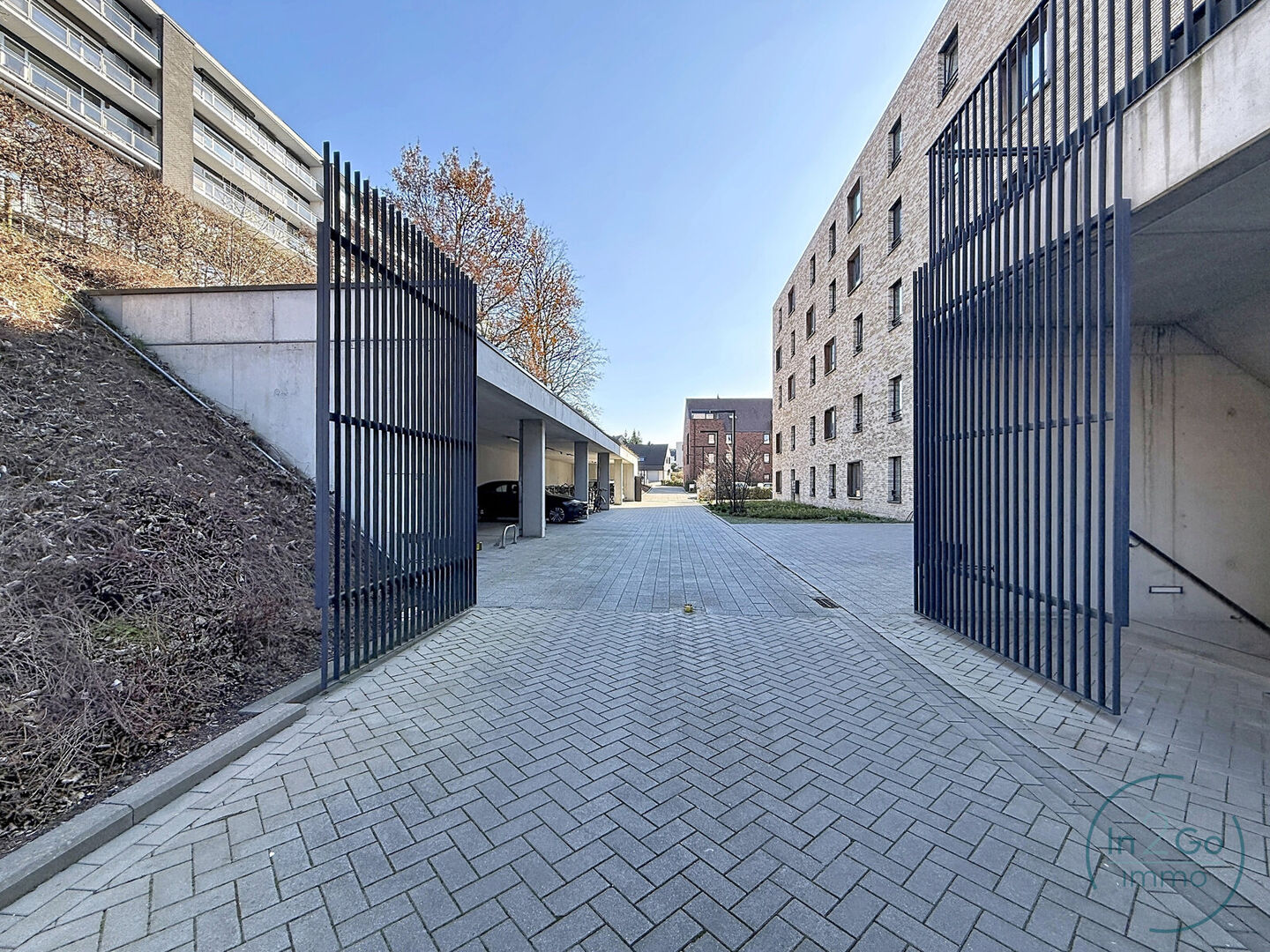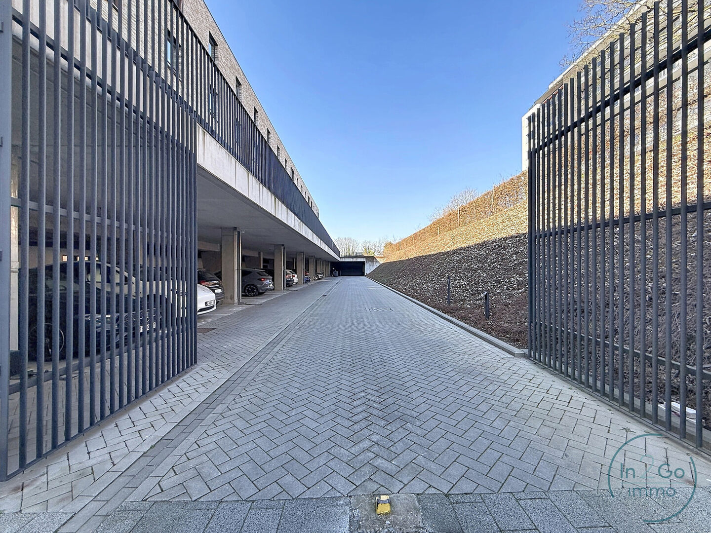 De parkeerplaats is gesitueerd achter een automatisch hek.