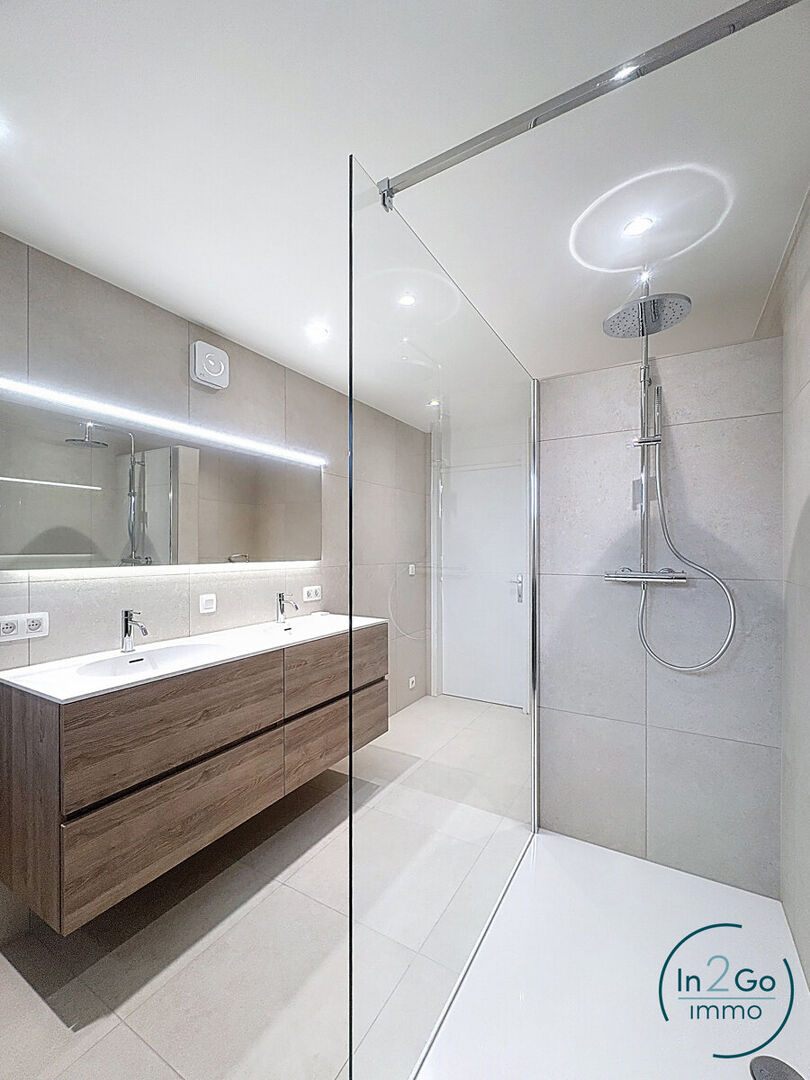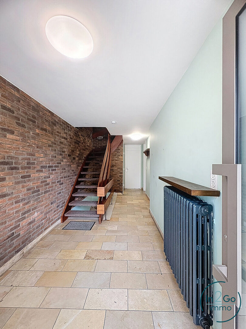 U betreedt de woning via de inkomhal waar zich ook een afgesloten bureauruimte bevindt, een gastentoilet en een wasplaats. Via de trap komt u in de aangename leefruimte met zeer grote ramen en een terras zowel aan de voor- als aan de achterkant. Aansluitend is er de volledig geïnstalleerde keuken met ingebouwde koelkast en diepvries, inductiekookvuur, afzuiging en vaatwasmachine. Vanuit de keuken heeft u zicht op de achterliggende tuin.