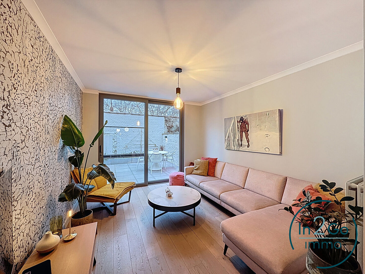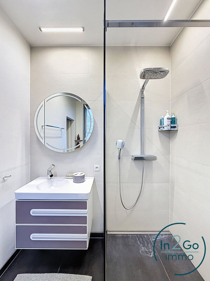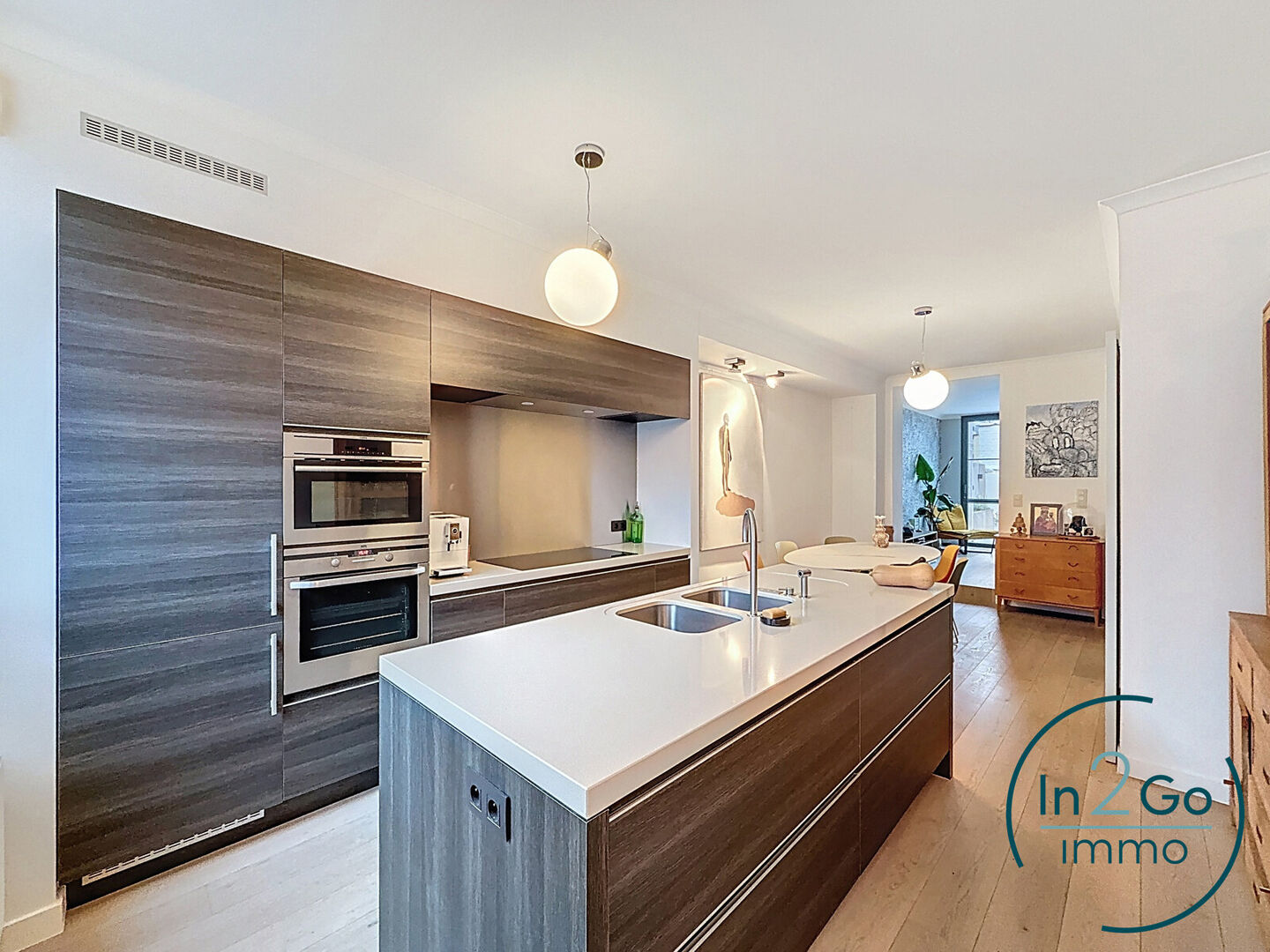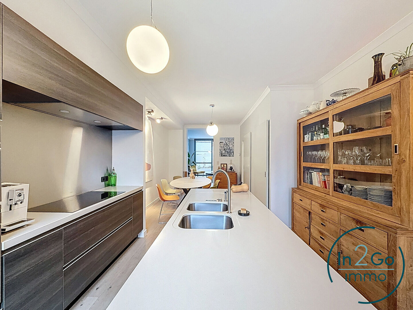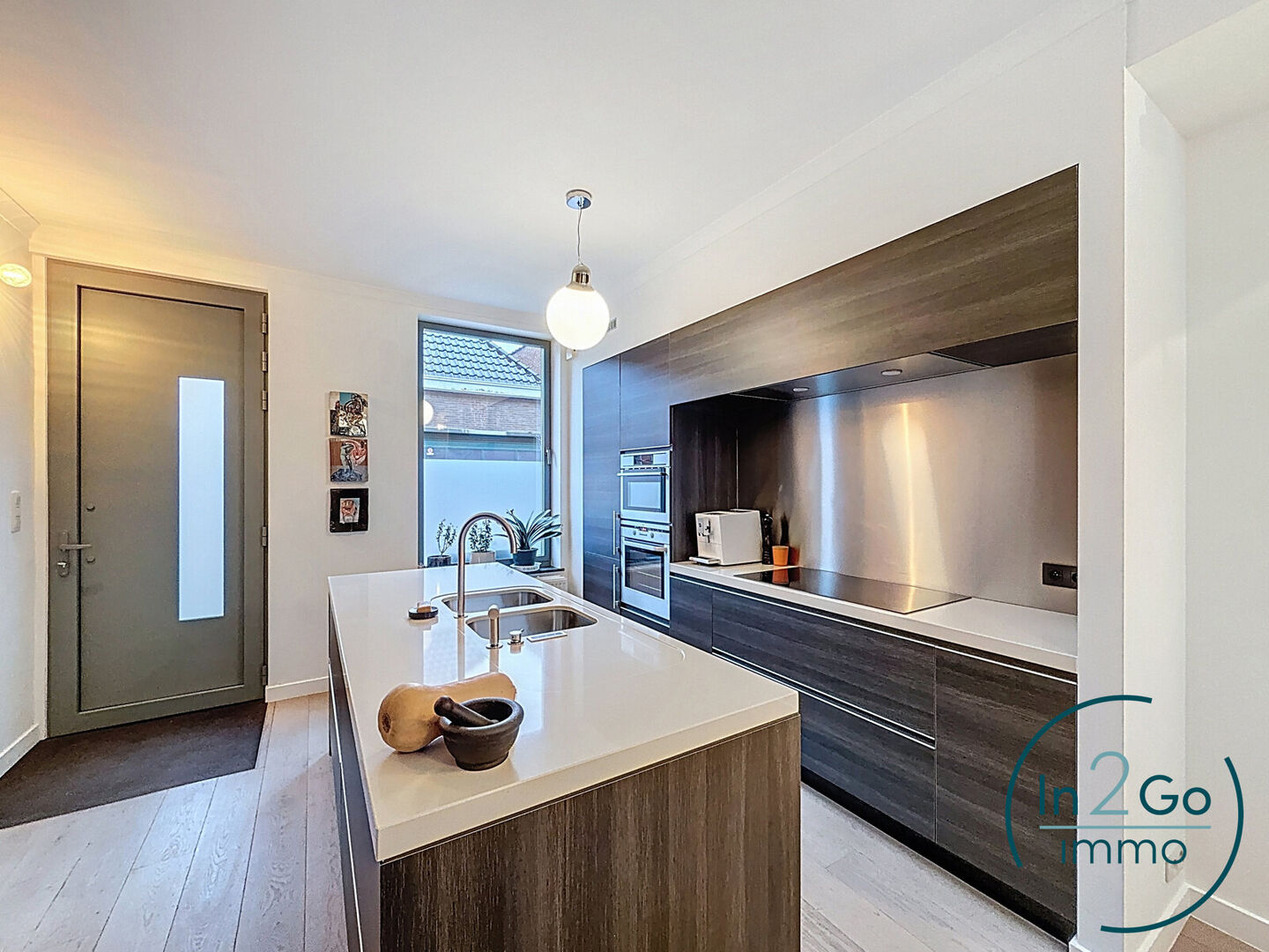 Bij het betreden van de woning komt u rechtstreeks in de volledig uitgeruste keuken, die naadloos overgaat in de rest van de leefruimtes. De keuken is uitgerust met een inductiekookvuur, full size frigo, vaatwasmachine, heteluchtoven, microgolfoven en een luxueuze Aqualex-kraan die gefilterd en gekoeld water met of zonder bruis voorziet. Aansluitend bevindt zich de eetruimte, centraal in de woning en ideaal voor gezellige maaltijden. Achteraan ligt de leefruimte, die dankzij het grote schuifraam een mooie connectie maakt met het terras, hier vinden we nog een extra bergruimte terug. Er is tevens een handige opbergkelder.