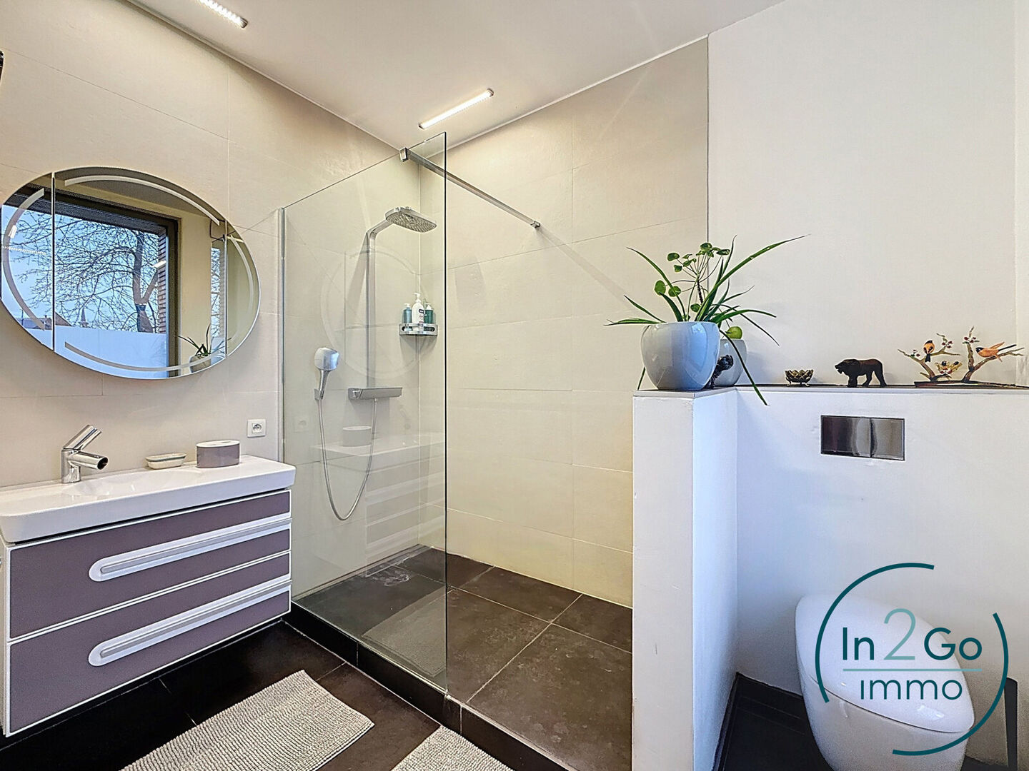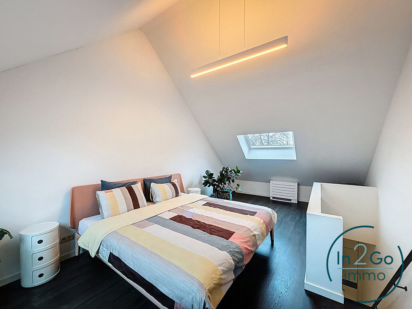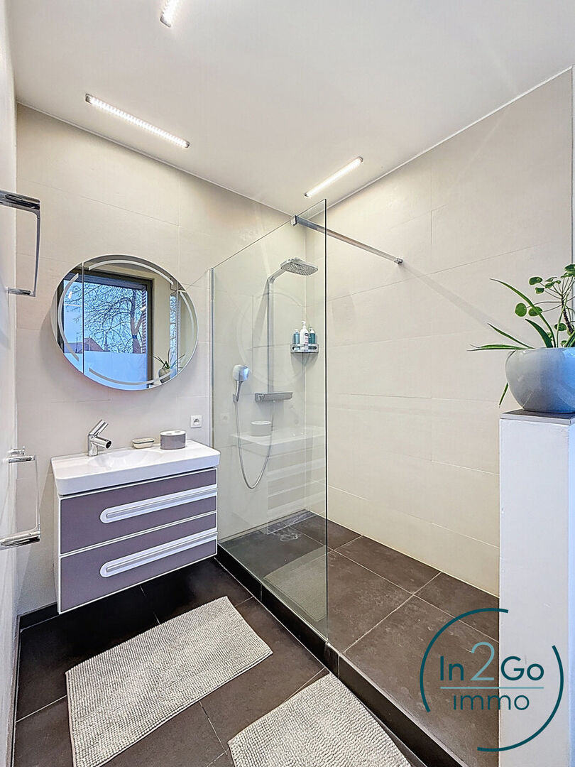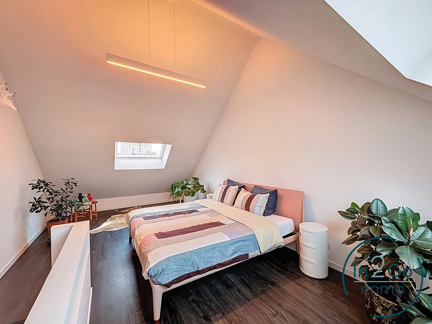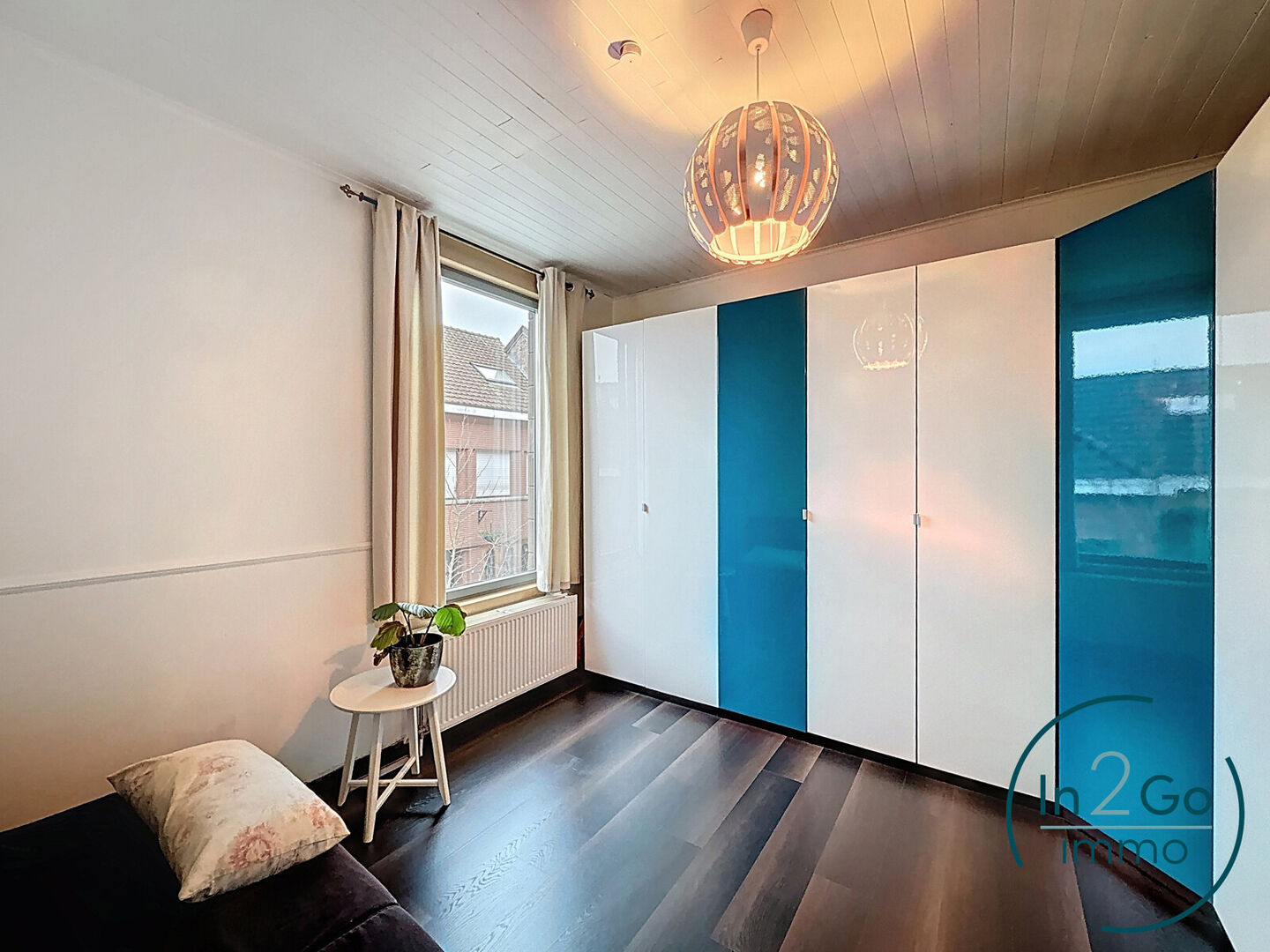 Op de eerste verdieping bevindt zich een volwaardige slaapkamer, een praktische berging en de badkamer, uitgerust met een inloopdouche, lavabo en toilet. De tweede slaapkamer beslaat de volledige bovenverdieping onder het dak en fungeert als ruime master bedroom. Deze kamer is voorzien van een airco-unit en Velux-ramen met zowel blindering als rolluik, wat zorgt voor optimaal comfort het hele jaar door.