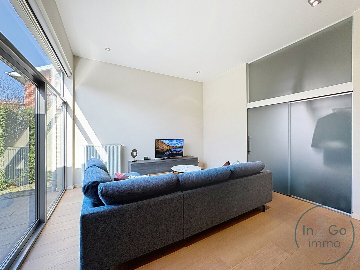 Eens in de leefruimte vallen meteen de hoge plafonds met inbouwspots en de warme parketvloer op. Goed om weten is dat de designlamp boven de eettafel ook blijft hangen.