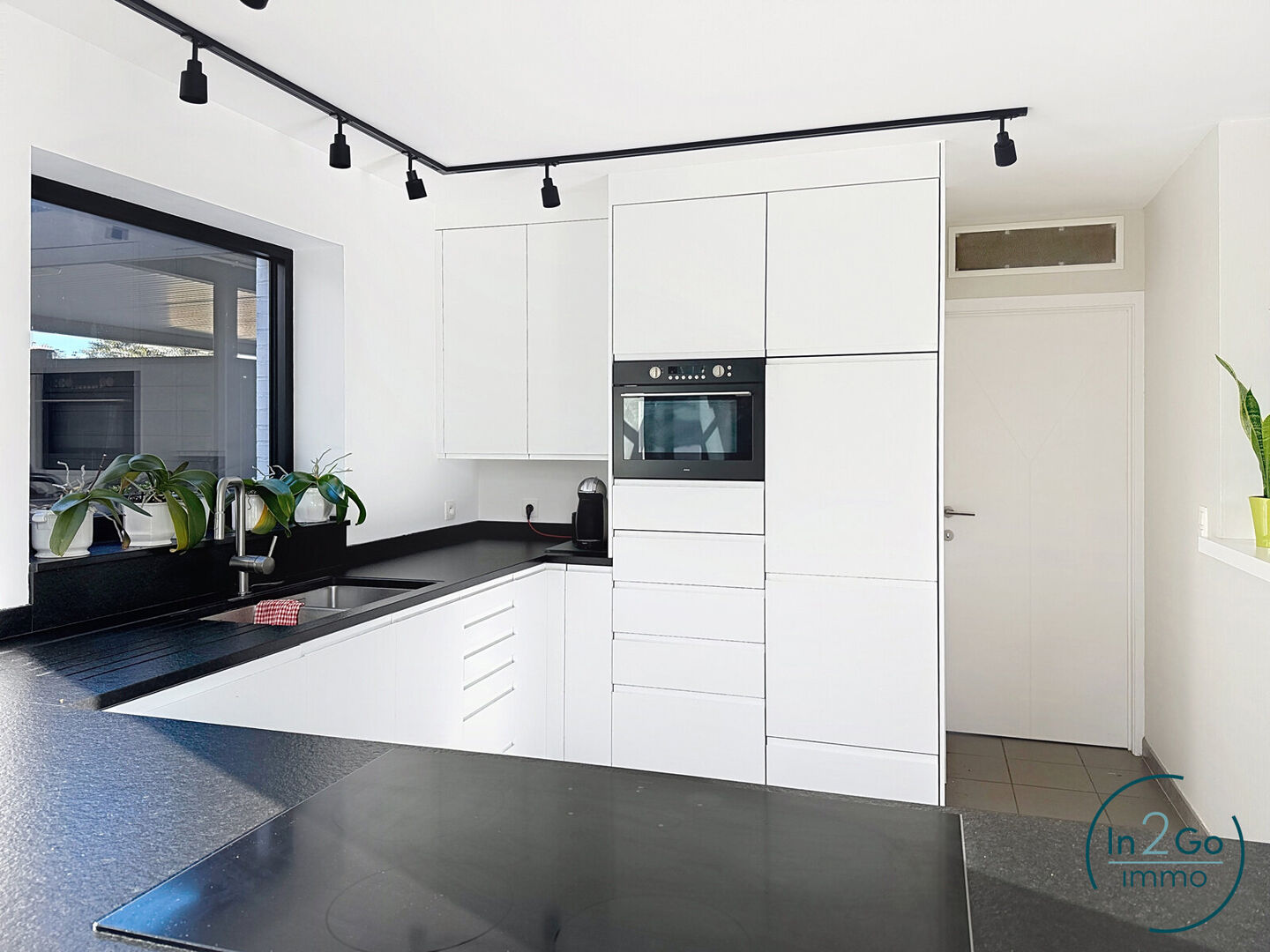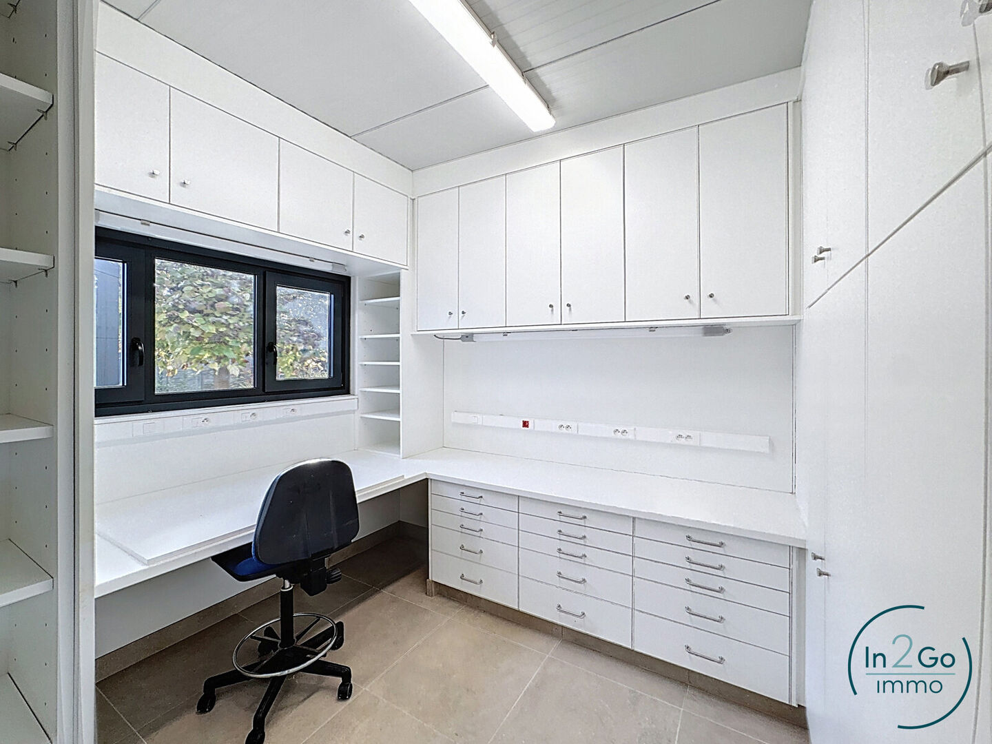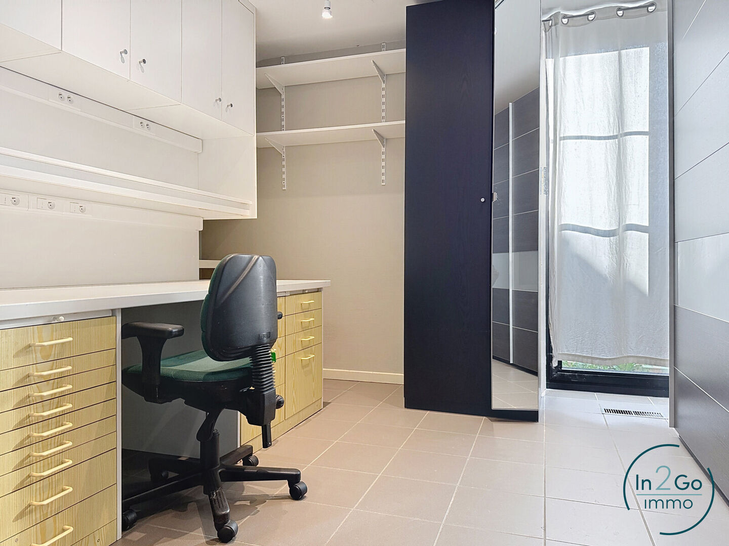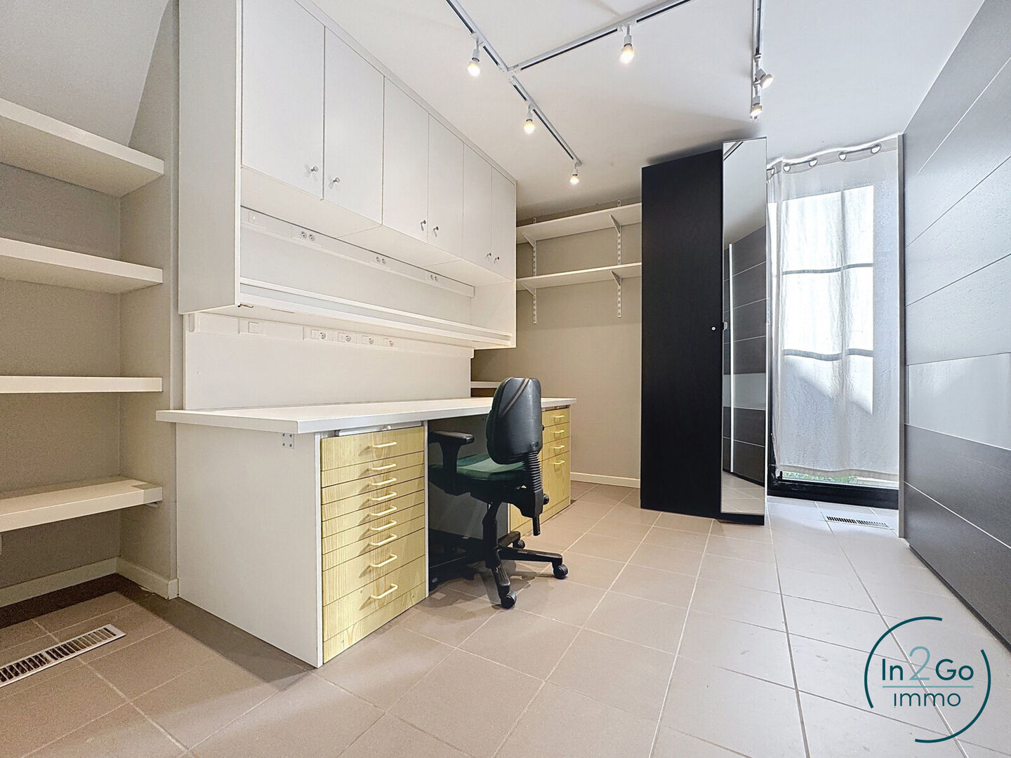Ook is er een gastentoilet voorzien. Via de inkomhal kan u ook de bureauruimte (14m²) met op maat gemaakt bureau ontdekken. Een ruime living met zithoek baadt in het licht en gaat mooi over in de open kwalitatieve keuken die volledig werd uitgerust. Een vide geeft een royaal gevoel aan de bewoners.