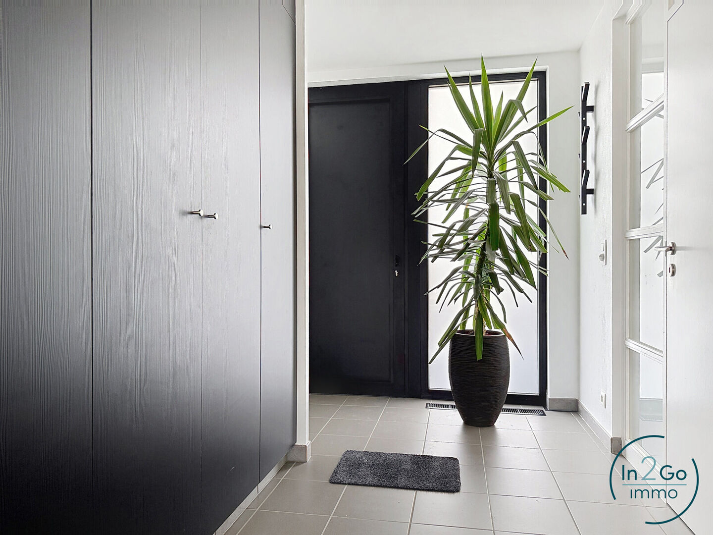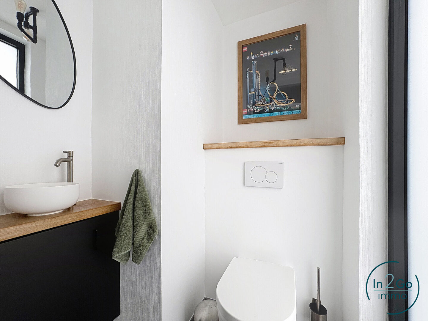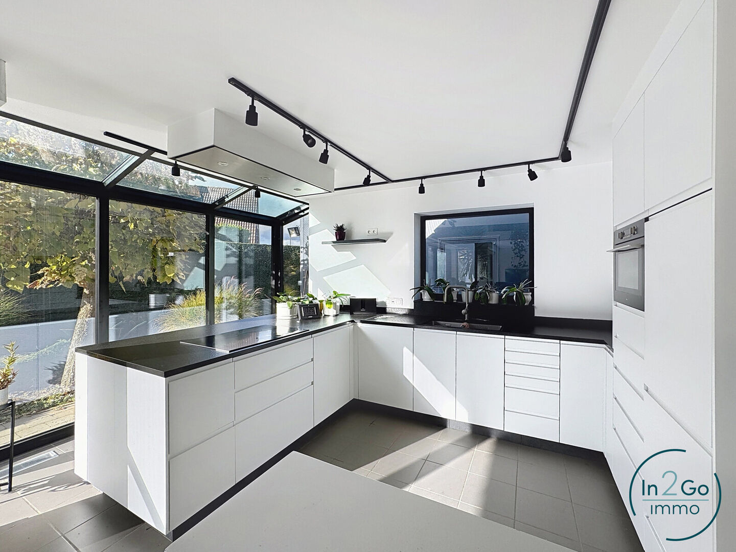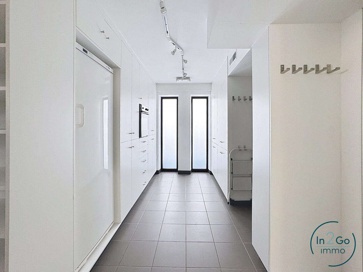 Ook is er een gastentoilet voorzien. Via de inkomhal kan u ook de bureauruimte (14m²) met op maat gemaakt bureau ontdekken. Een ruime living met zithoek baadt in het licht en gaat mooi over in de open kwalitatieve keuken die volledig werd uitgerust. Een vide geeft een royaal gevoel aan de bewoners.