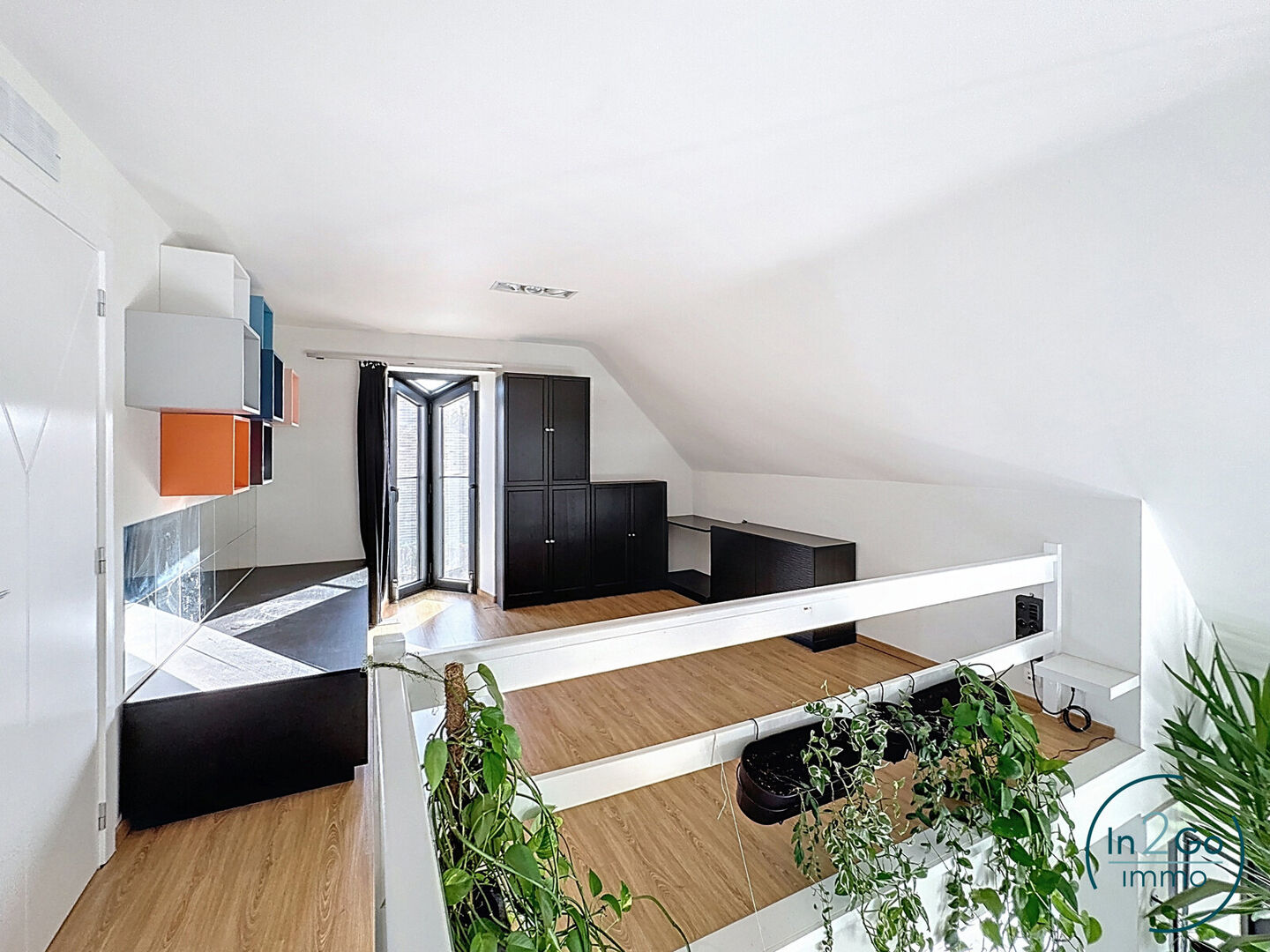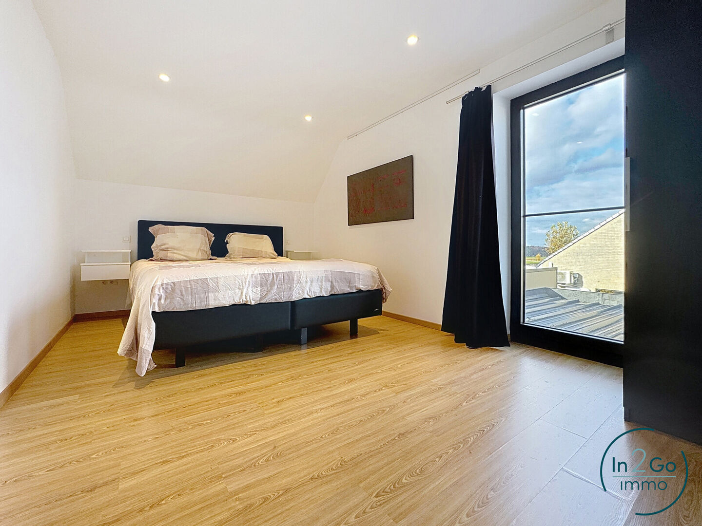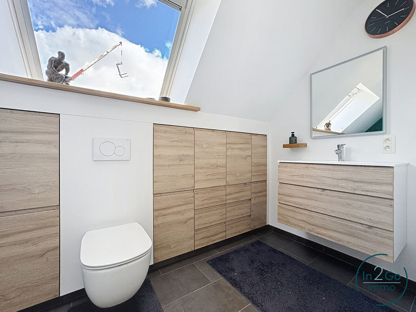Op de eerste verdieping zijn er een masterbedroom (21m²) met ingebouwde dressingkasten, een kleine zolderberging, een tweede slaapkamer met ingebouwde kasten (11m²) en een badkamer ( bad, lavabo en WC) ingericht. De kers op de taart is de extra zitruimte aan de vide.