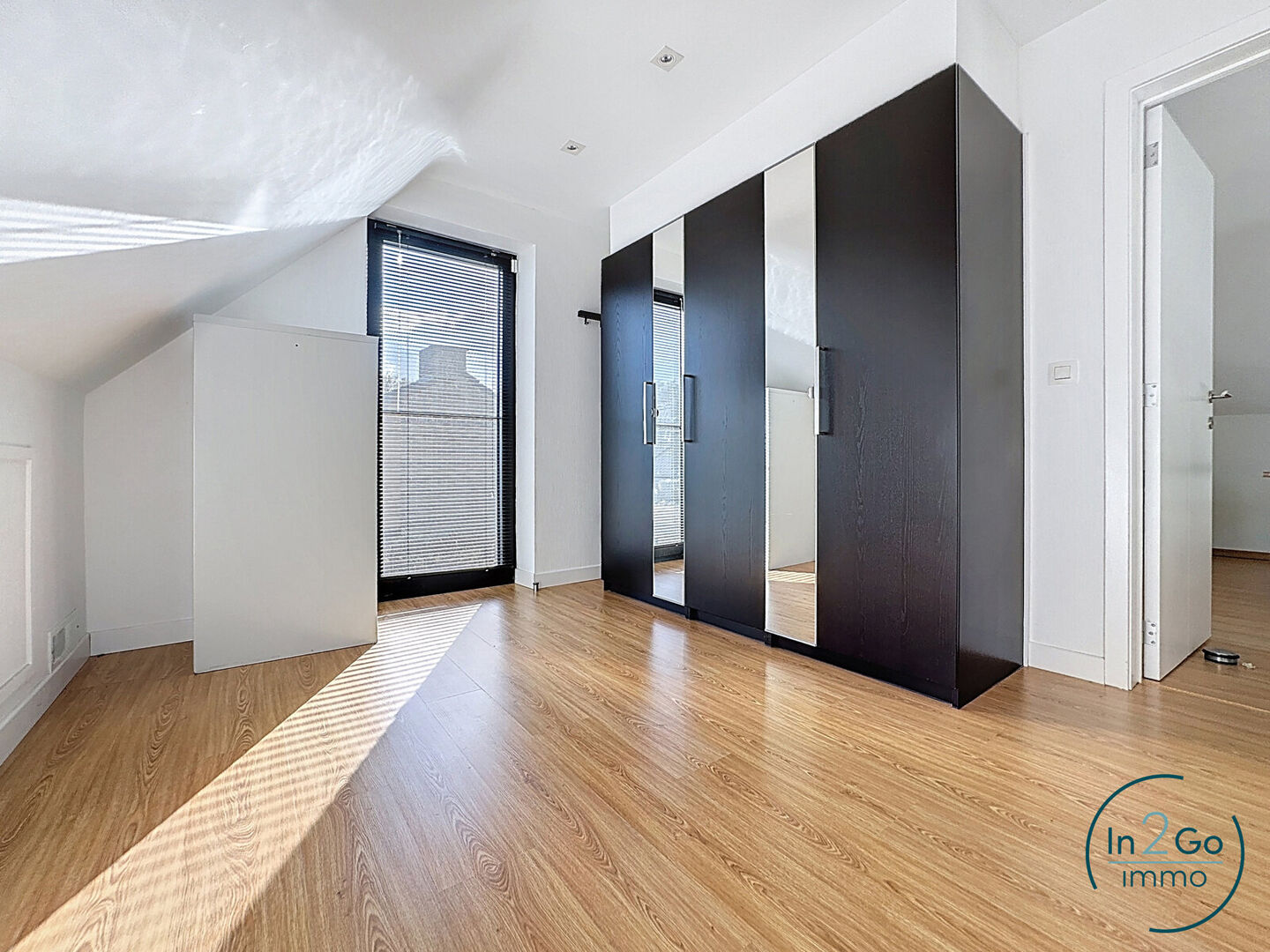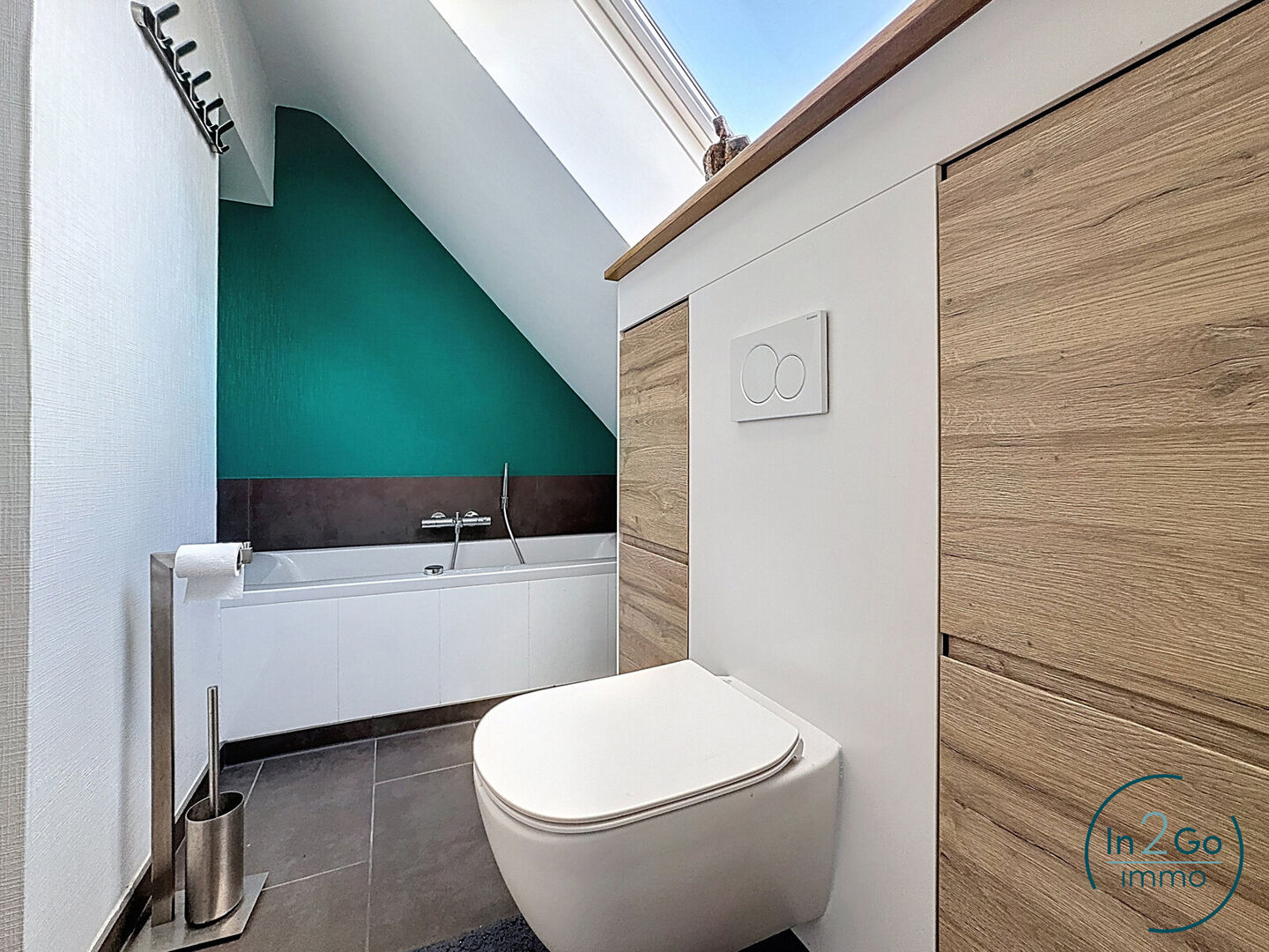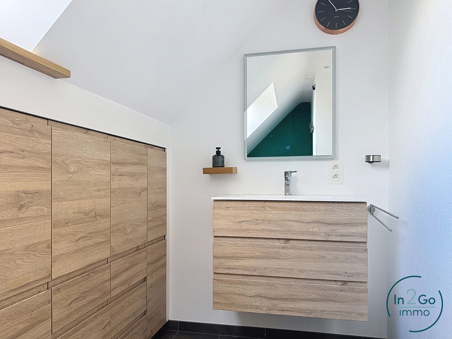 Op de eerste verdieping zijn er een masterbedroom (21m²) met ingebouwde dressingkasten, een kleine zolderberging, een tweede slaapkamer met ingebouwde kasten (11m²) en een badkamer ( bad, lavabo en WC) ingericht. De kers op de taart is de extra zitruimte aan de vide.